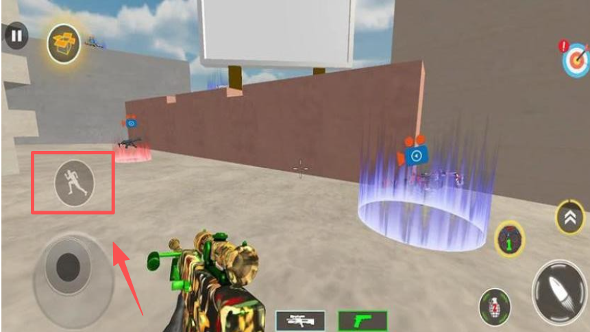 1、点击左下角的虚拟摇杆,控制角色移动,寻找敌人或掩体。