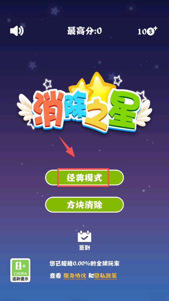 1、点击 “经典模式” 按钮,进入经典消除游戏模式。