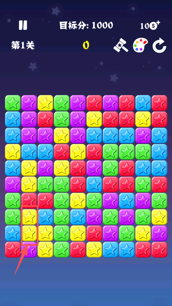 2、在游戏界面,点击相同颜色的星星,进行消除得分。