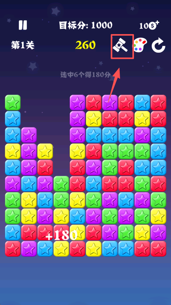 3、点击锤子图标,可使用锤子道具帮助消除星星。