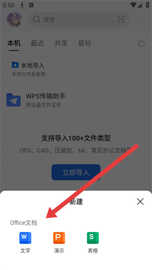 2、在弹出的新建功能菜单中,需要点击Office文档板块下的文字选项,进入新建文档的页面。