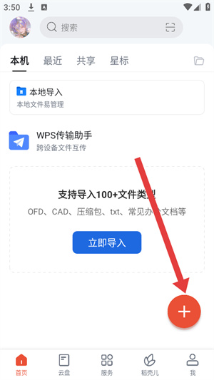 1、打开WPS Office的app软件,在首页右下角找到红色+号按钮,点击该按钮弹出新建功能菜单。