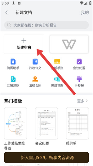 3、在新建文档的页面中,需要点击新建空白的选项,这样我们就可以创建一个新的Word文档。