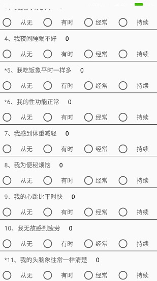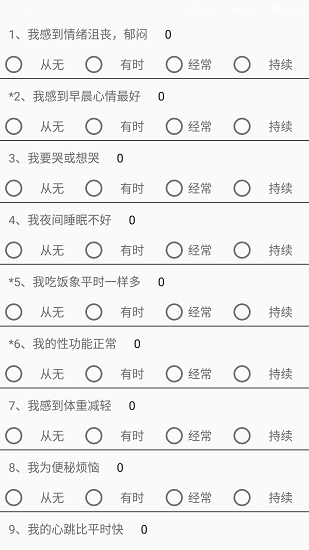 生活、工作、学习等各方面不如意,压力越来越大,想找心理医生聊一聊,又担心说不出口、费用高等问题,自从有了这个精神科抑郁症自测app,以上问题轻松解决。打开精神科抑郁症自测app,可以通过做题来测试自己的心理情况,找到问题所在,及时解决问题。还能在精神科抑郁症自测app做题过程中更加清晰的认识到自己,了解自己的优点、缺点,做更好的自己。