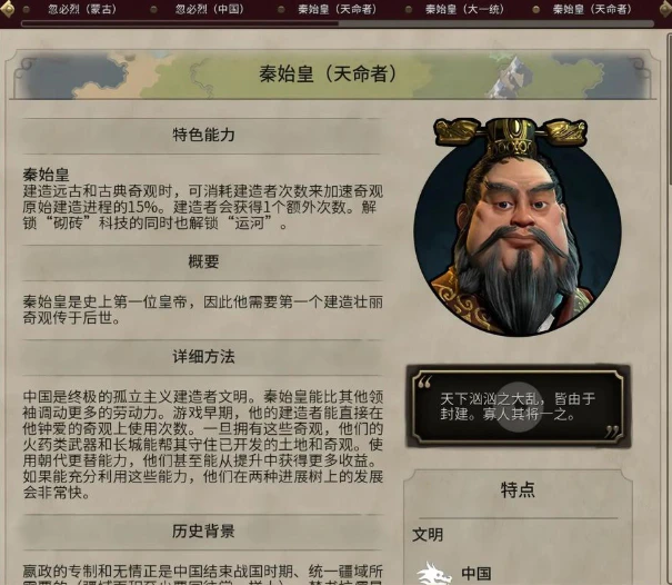 秦始皇:建造远古和古典奇观时,可消耗建造者次数来加速奇观原始建造进程的15%。建造者会获得1个额外次数。解锁“砌砖”科技的同时也解锁“运河”。