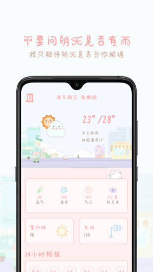 天气物语app最新版是一款深受广大女性用户喜欢的天气预报软件,这款软件以粉色为主,拥有超多q萌可爱的图标,深受广大小仙女喜爱,拥有非常精美的界面,还有丰富的素材以及背景等你来自由更换,让用户获得更好的服务。天气物语app最新版提供了精确的天气预报功能,拥有多维度的天气信息等你来查看,轻松满足用户的天气预报需求,可以轻松获取24小时的天气信息以及我来15天的天气预报。天气物语app最新版还有空气质量,制度,气压,能见度,紫外线,风向等信息等你来查看,喜欢的话千万不要错过,感兴趣的用户快来下载体验。