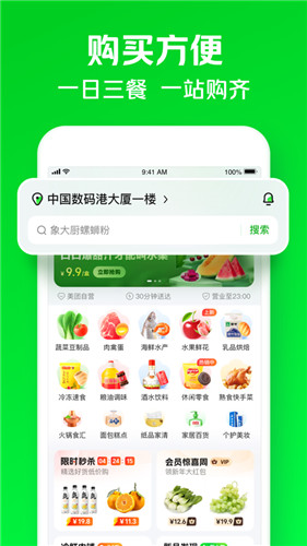 新鲜蔬菜、水果、肉禽蛋、米面粮油、水产海鲜、方便速食,解决一日三餐所需食材!