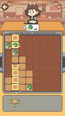 2、这里我们需要将最下方的方块拖入到格子中,只要满足“整行”或“整列”就可以消除,可以看到该关卡的目标是:消除10颗白菜。
