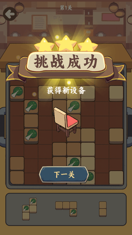3、该关卡挑战成功会获得新设备,这些解锁获得的设备可以用来升级或装饰店铺,继续下一关卡的挑战吧,点击“下一关”。