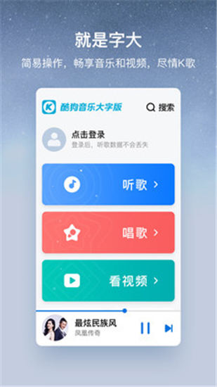 安卓酷狗音乐大字版vip破解版这是一款功能奇迹强大的手免费听歌神器,相信这款软件大家都不会陌生,而酷狗音乐大字版这是酷狗专门为叔叔阿姨们所精心设计的全新播放软件,在字体的显示上,无论是界面,还是歌词等等都做了优化,让字体更加大,更加方便中老年人使用,去广告去升级,更清爽,破解版更是让用户们可以收听全网所有的歌曲,无需付费即可下载海量歌曲,喜欢这款音乐播放软件的小伙伴们快来跟我一起下载体验吧。