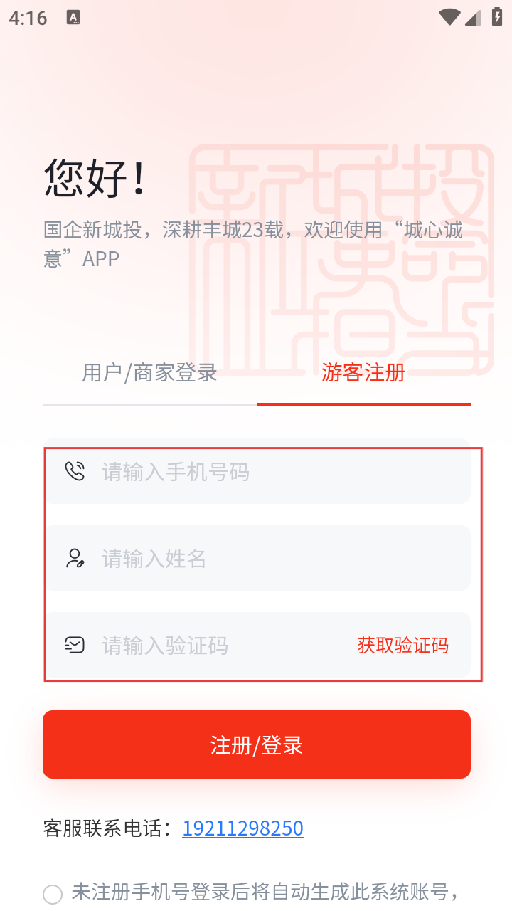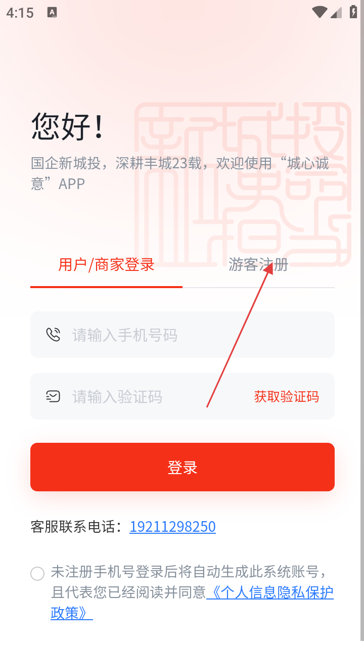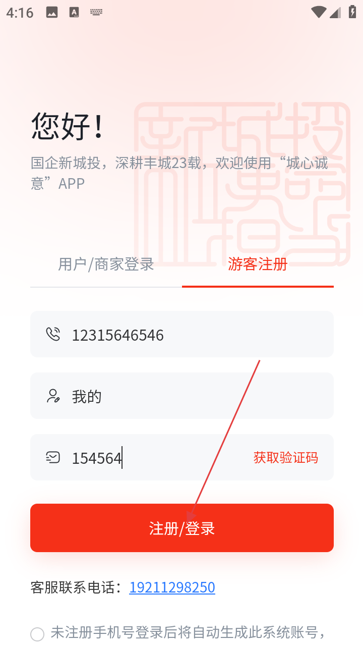 4、查看手机收到的验证码,将其准确填入【验证码输入框】,确认所有信息无误后,点击【注册/登录】按钮,完成整个游客注册操作。