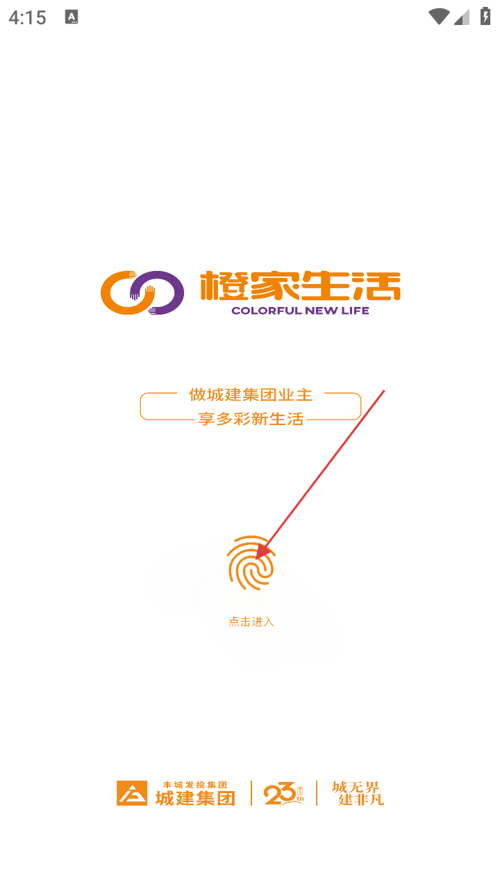 1、打开“橙家生活”APP,在应用启动页找到并点击【点击进入】按钮,进入登录注册主页面。