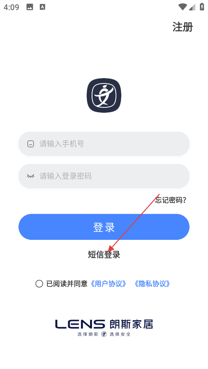 2、完成协议确认后,进入应用登录页面,在登录方式选择区域找到并点击【短信登录】选项,切换至短信登录模式。