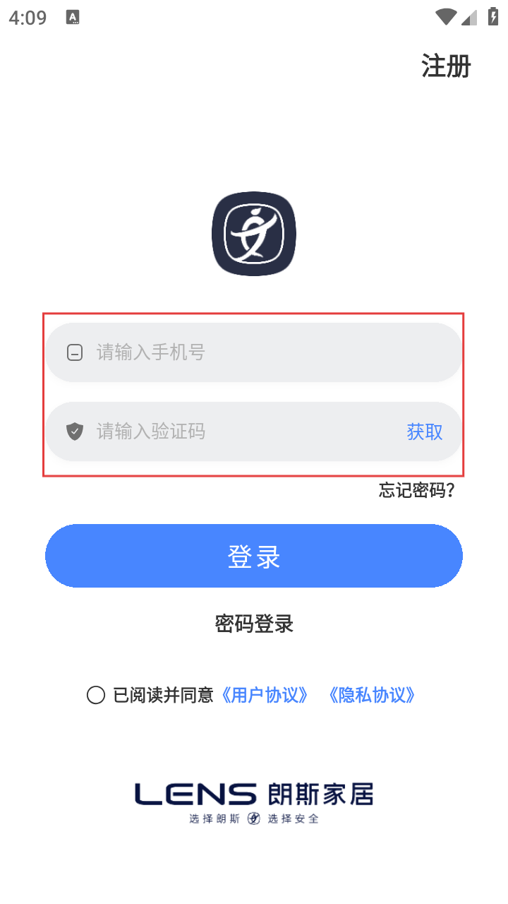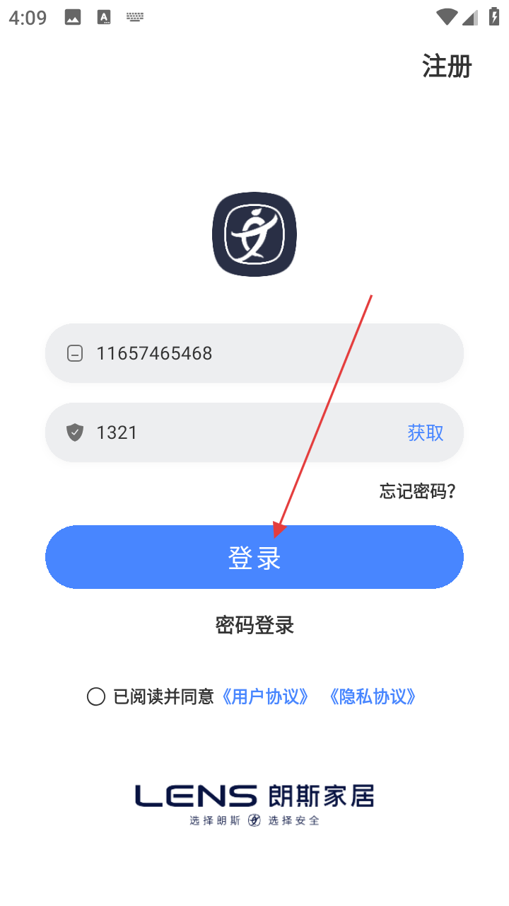 1、打开【朗斯智家】应用,页面会弹出温馨提示框,然后点击【同意】按钮,进入后续页面。