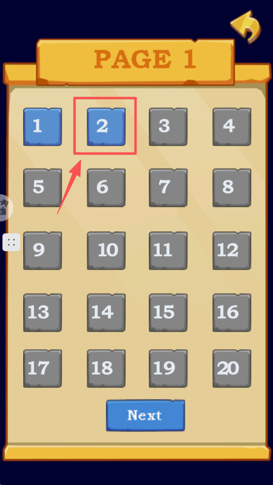 2、选择关卡界面,点击已解锁的关卡1,进入对应关卡继续游戏。
