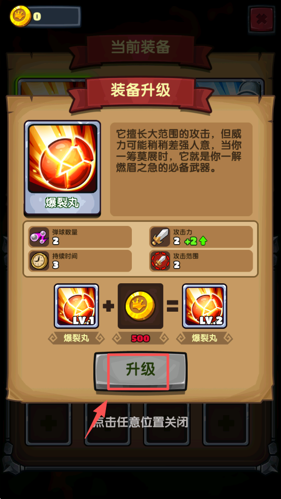 4、点击任意位置关闭装备升级界面,返回游戏,继续你的冒险。