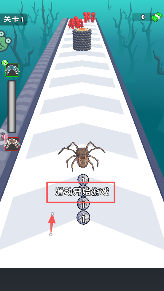 2、点击屏幕控制蜘蛛移动,避开障碍物,收集金币。