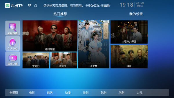 安卓九洲TV电视版是一款专为电视机用户打造的影视盒子软件,软件拥有一个丰富的影视资源库,而且还进行了详细的分类,列如电视剧、电影、综艺、美剧、韩剧、动漫等分类,并在分类专区中添加了菜单功能,在菜单功能的帮助下,用户可以在分类的基础上再次对影视作品进行类型、年份、地区等筛选,从而帮助用户轻松找到自己喜欢看的影视作品。另外,软件上的影视作品都是以超清画质的形式呈现在用户面前,让用户在家就能享受到堪比电影院般的观影体验。如果你是一位平时喜欢用电视机来观看影视作品的用户的话,那么本次小编带来的九洲TV电视版你可千万不要错过哦!