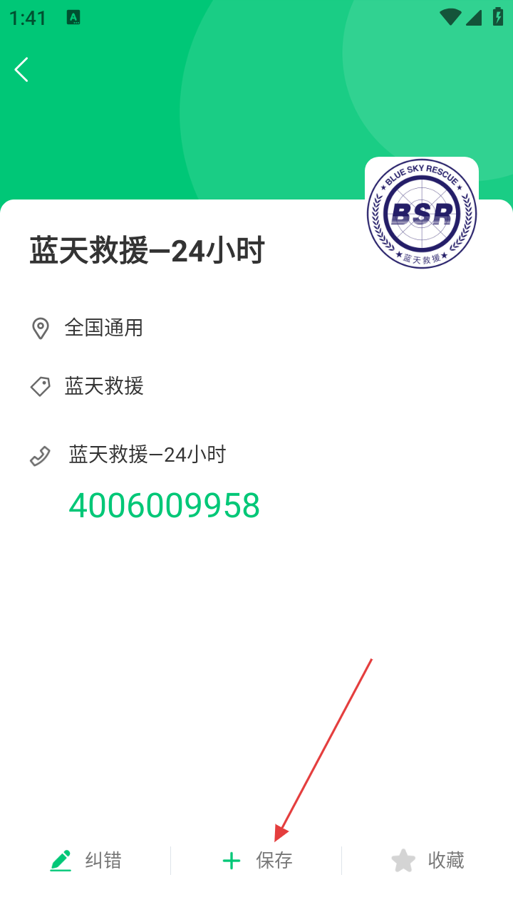 3、点击【蓝天救援-24小时】,进入其详情页,可查看联系电话4006009958等信息,点击【保存】。