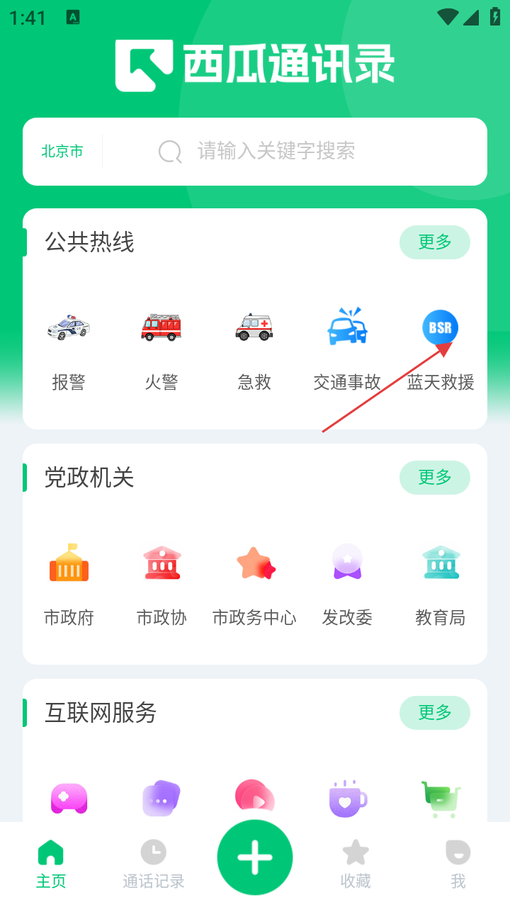 1、打开“西瓜通讯录”APP,在首页公共热线区域点击【蓝天救援】,进入蓝天救援页面。
