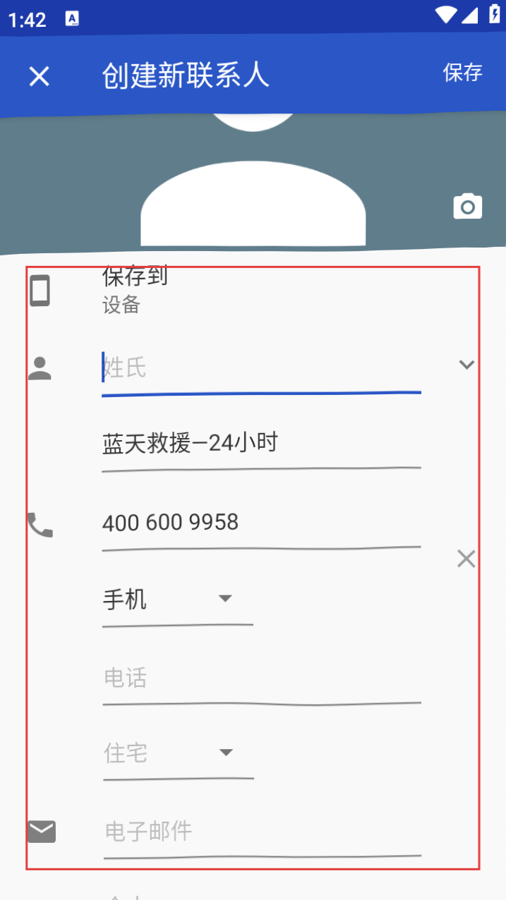 4、在创建新联系人页面,确认“蓝天救援-24小时”及电话4006009958等信息,点击【保存】完成新联系人创建。