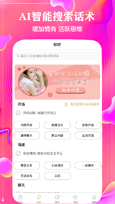 安卓聊天话术神器app安卓版是一款非常强大的聊天工具软件,如果你还在为不知道怎么和别人聊天而感到烦恼的话,那么这款软件你一定要下载试一试,保证不会让你失望哦。c此外,这里聚集了恋爱交友、职场沟通、客户谈判、聚会闲聊等等各种话术聊天模板,满足于不同人群的需求。此外,支持微信、QQ、探探、陌陌一键粘贴,十分方便。有了这款软件之后,再也不用担心不会说话而苦恼了。不仅如此,聊天话术神器免费版内置了50万+的智能话术软件,一键搜索回复妹子说的话,帮助你解决尬聊问题,说不定就因此脱单了,非常强大。除此之外,觉得这款软件不错的话可以一键分享给你的朋友一起看哦。对这款软件感兴趣的小伙伴还在等什么,心动不如行动,快来下载体验吧!