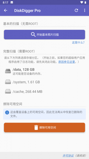 安卓diskdigger pro官方正版是一款免费好用的手机数据恢复软件,虽然软件体积小巧,不到10MB,但是其中的功能却很强大,可以帮助用户轻松恢复自己不小心删除掉的照片。软件支持两种扫描方式,分别是基础扫描和完整扫描,这两种寻找方式都各有各的优缺点,用户只需要根据自身需求选择适合自己的扫描方式既可,就这么来说吧,如果用户只需要恢复删除掉的照片的话,那么基础扫描方式就可以了。此外,diskdigger pro官方正版具备擦除可用空间功能,通过该功能用户可以轻松覆盖设备上的可用空间,这样一来那些被删除的本地文件就无法再被恢复了。