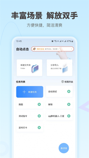 安卓自动按键点击app是一款非常实用的手机屏幕自动点击软件,软件为用户提供了强大的自动点击功能,通过自动点击功能用户可以完成许多重复且单调的事情,列如抢红包、游戏日常任务、软件打卡等等,从而就此解放双手。软件的使用方式也是非常简单的,用户只需要先创建任务列表,然后自己操作一边,最后保存操作就行了,如果还没有还懂的话也不用急,因为软件为了照顾小白用户特意提供了十分详细的使用教程,所以用户也可以跟着使用教程一步步来。另外,自动按键点击app支持导出功能,可以导出用户制作好的自动点击任务,更好地分享给其他人。有自动点击需求的用户还在等什么,快来本站下载使用吧!