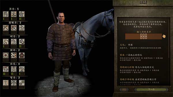 首先给大家看一下我开局属性,因为经过了教学任务的战斗,单手和弓还有骑术的熟练度上升了。