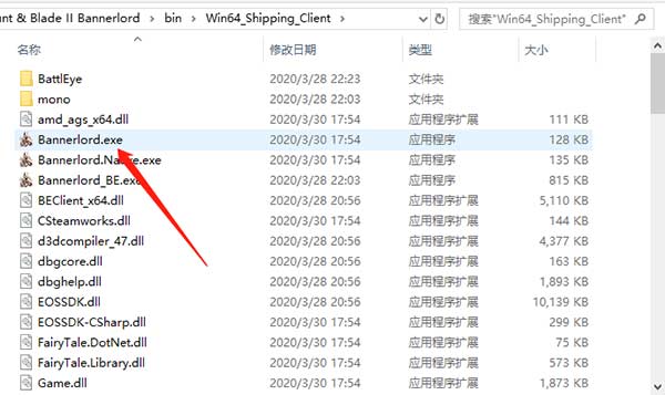 6、在Win64_Shipping_Client文件夹中,左键双击Bannerlord.exe进入游戏;
