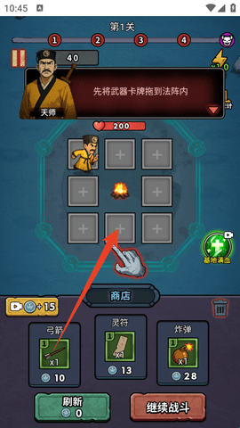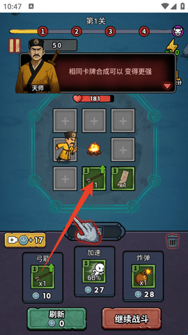 4、然后继续将获得的道具拖入到方格中吧,相同卡牌道具可以完成合成,变得更强。