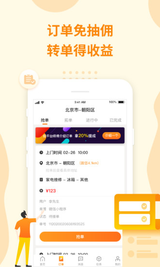 万能小哥师傅端下载苹果版是一款专门为广大的维修和安装的师傅们准备的手机接单软件,有了这款软件,你就不再需要进行等待熟人或者是电话名片的接单了,它能够带给你海量的订单,让你可以自由的选择喜欢的订单来进行接单完成。在万能小哥师傅端下载苹果版上,你可以在这里创建自己的网上店面,设置多种的维修技能,就可以等待系统的派送订单,或者是自己寻找合适的订单来完成,这里面有着非常透明的价格,你可以和买家进行商量,而且平台还能够为你进行投保,为你提供各种意外保险,帮助一些有需要的师傅们提供了技能提升的培训,觉得不错就来万能小哥师傅端下载苹果版吧。