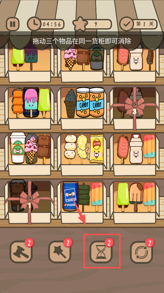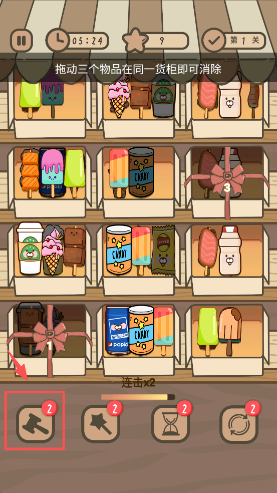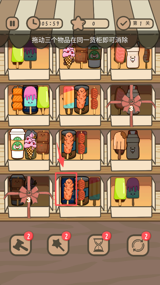 2、拖动三个相同的物品到同一个货柜中,即可完成消除,获取分数。