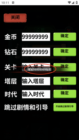 4、例如我们想要无限金币、无限钻石,直接输入你想要的钻石,点击确定。