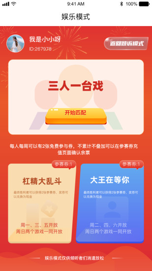 软件内置了娱乐的模式可以实时匹配用户进行有趣的游戏互动,不同的游戏开发的时间也都不一样,而且每个星期用户都可以领取免费的参与券。