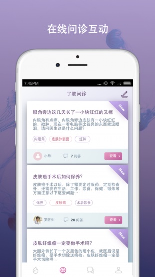 安卓了肤最新安卓版app是一款守护皮肤健康的掌上智能手机软件。在了肤app中每天都是数百名权威专家坐诊,时时为用户的皮肤问题提供专业解答。如果您刚好皮肤出现问题随时可以直接上了肤,拍照给医生进行问诊资讯。这样免去您跑医院,挂号、排队等一系列时间成本。在了肤除了有皮肤随时问诊的服务外还有为用户量身定制的体检套餐,更有非常周到的健康服务,比如提醒用户该用药该复查和术后护理等贴心提示。全方位保障您的皮肤健康。有需要的朋友快点来下载体验吧。