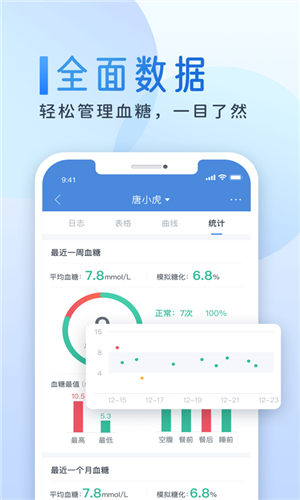 1、 实时自动记录:血糖数据可通过血糖仪自动记录,生成表格及分析曲线,免去血糖记录时纸笔麻烦以及无法掌握血糖变化规律的困扰。