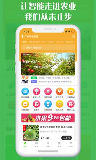 【租地种植】选择一块土地租下并购买种子>选择配送周期>开始种植,实时监控实时查看、远程控制浇水施肥,即可开始自己的私家菜园;种植成熟配送到家。【农业认养】选择果树并租下>选择配送周期>开始认养,实时监控实时查看,即可开始体验私家果园;果树成熟以后配送到家