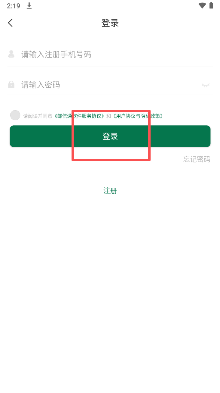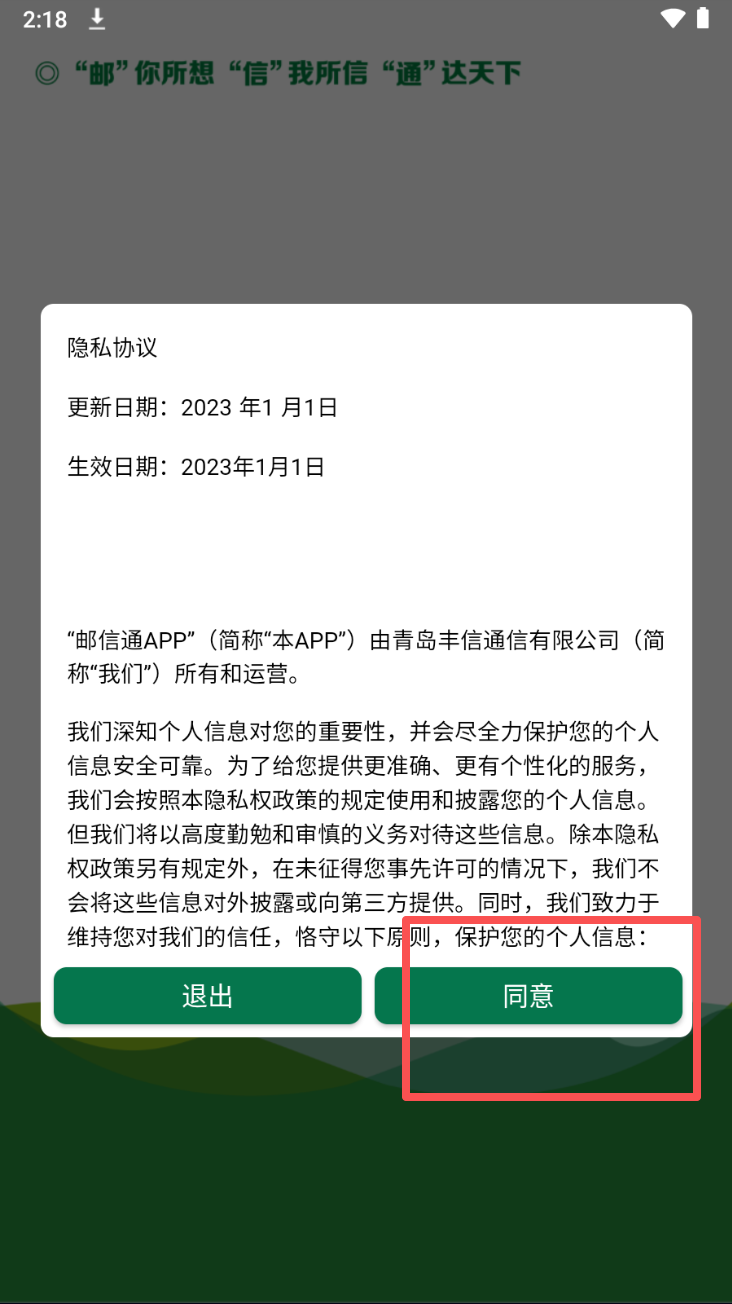 1、首先,打开邮信通APP并同意隐私协议,点击“同意”按钮进入下一步。