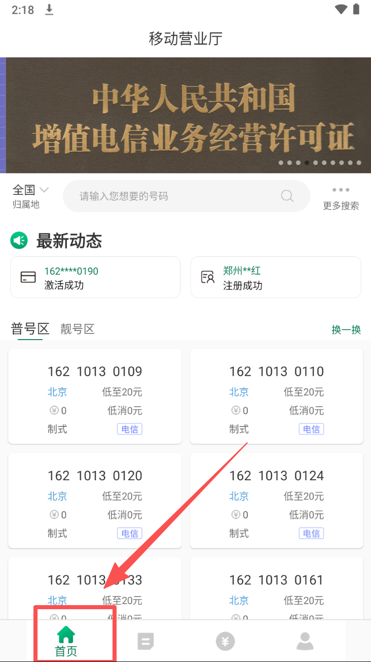 2、接着,在移动营业厅界面,点击底部导航栏的“首页”图标,进入号码选择页面。