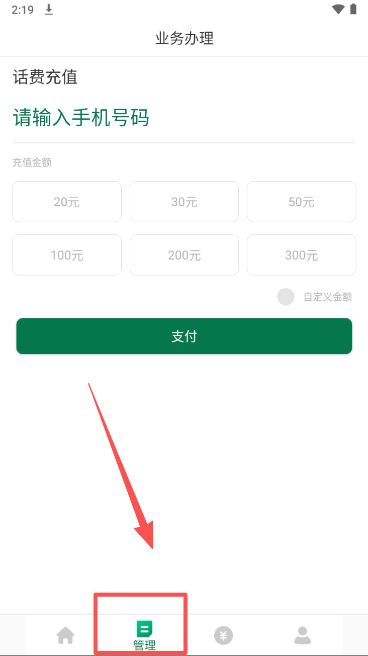 3、然后,在业务办理页面,选择“管理”选项,进入话费充值界面。