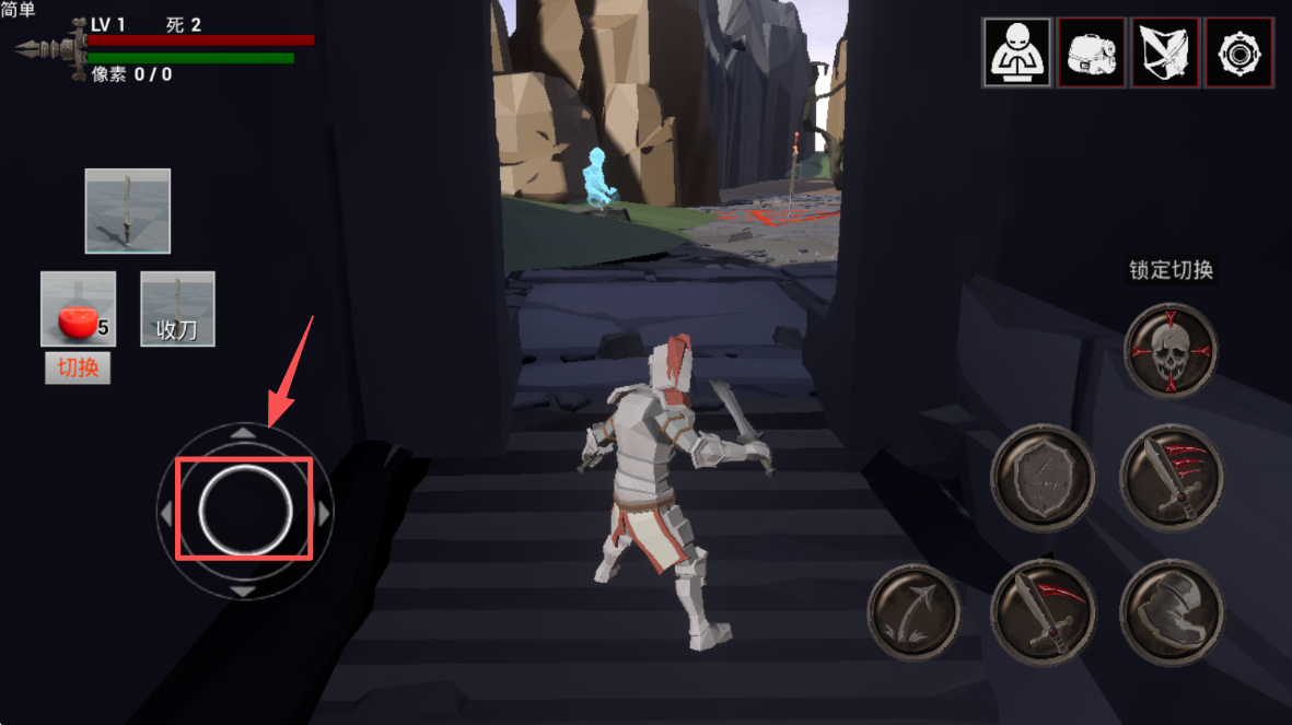 2、在战斗界面,使用虚拟摇杆控制角色移动,点击武器图标切换武器,准备战斗。