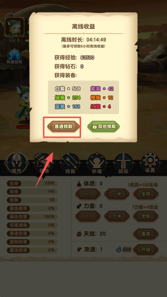1、点击“普通领取”按钮,领取离线收益,获取经验、钻石和装备,增加角色资源。