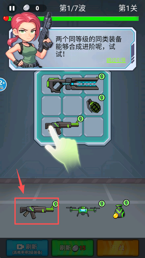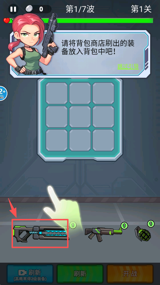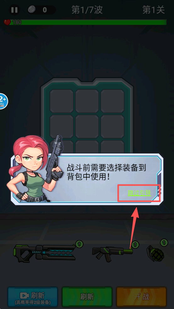 1、点击“跳过引导”按钮,选择你想要带入战斗的装备,准备战斗。