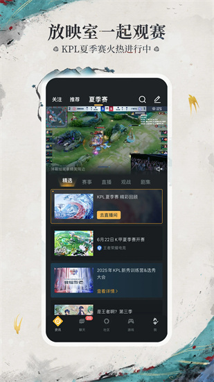 了解官方最新资讯、看直播、找攻略,发现王者新鲜事。2、赛事: