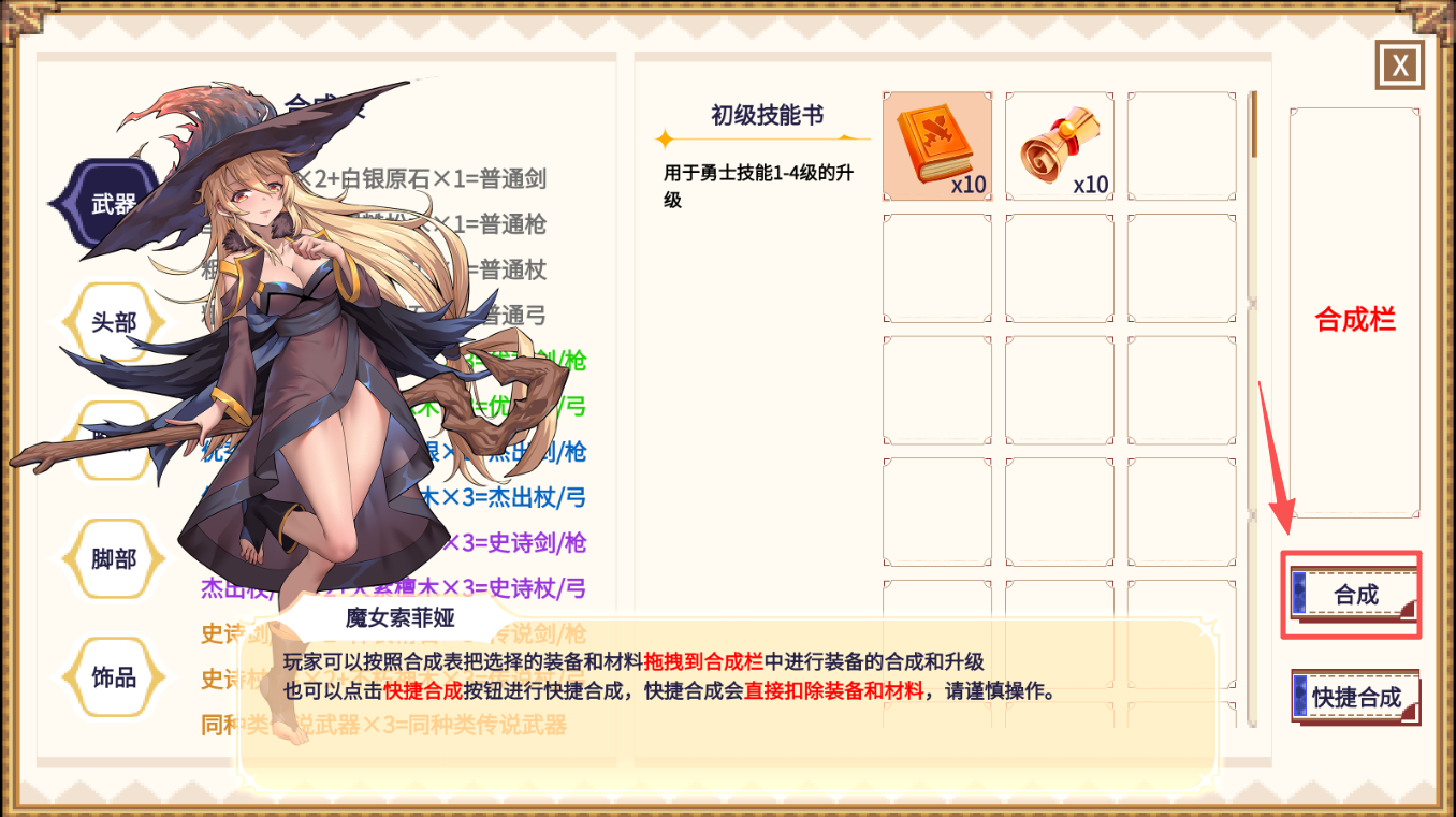 4、最后,在合成界面中,将装备拖入合成栏,点击“合成”按钮,制作更高级的装备。