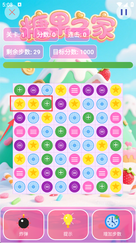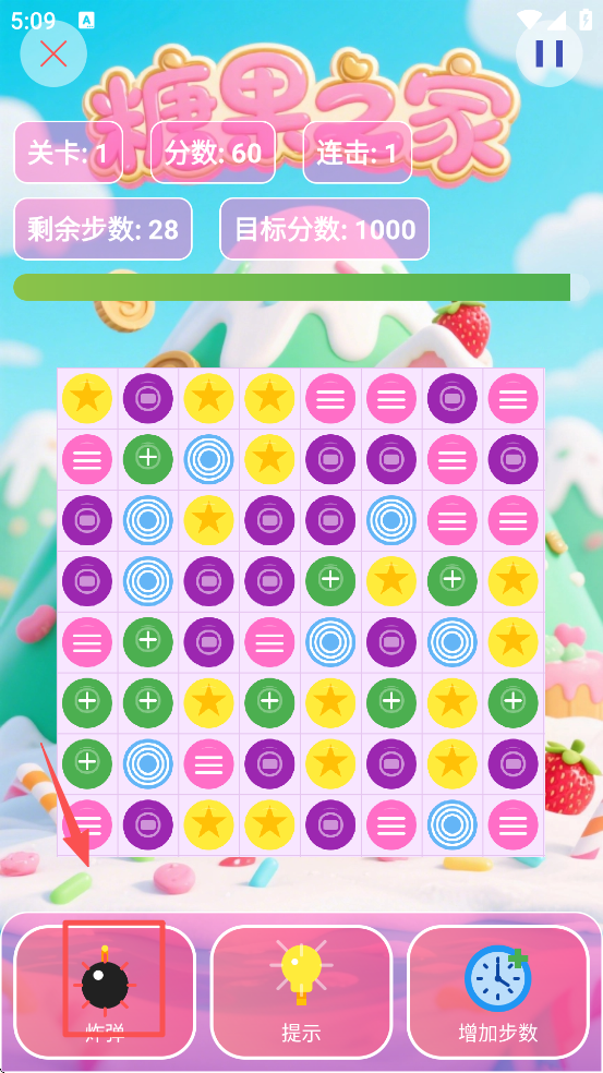 4、利用炸弹等道具帮助消除更多糖果,更快达到目标分数。