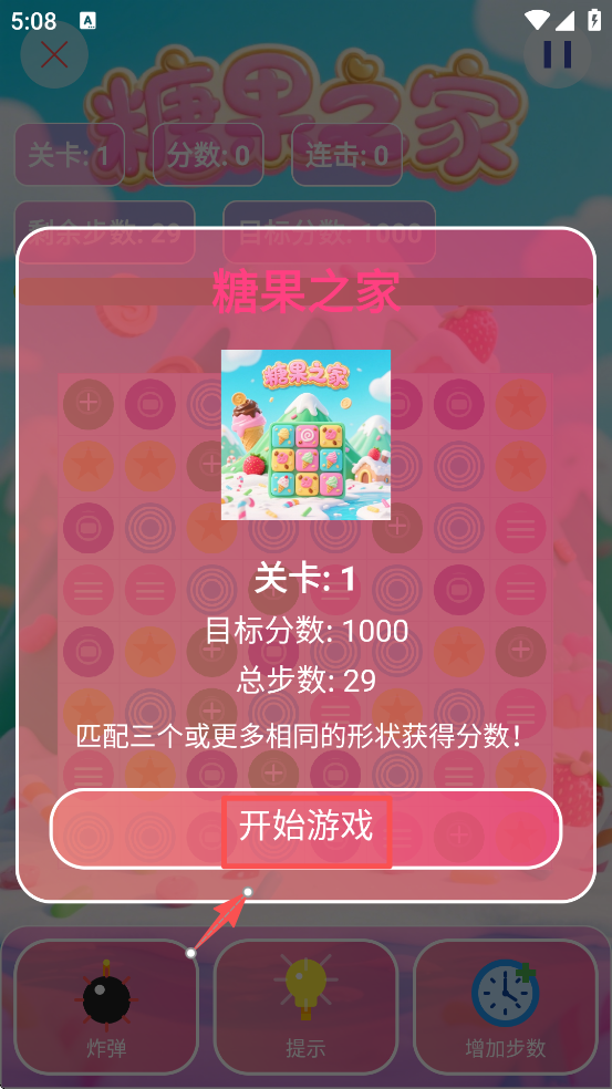 1、点击“开始游戏”按钮,进入游戏界面,开始你的糖果消除挑战。