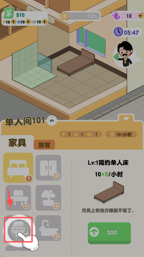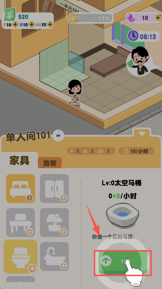 4、点击“价值一个亿的马桶”图标,购买并放置,增加客房价值。