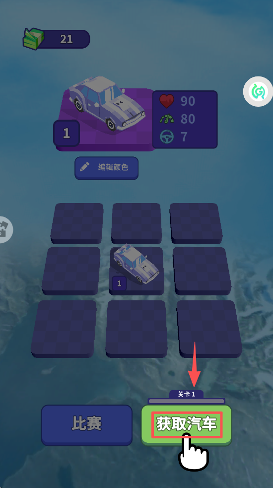 3、在主界面点击“获取汽车”按钮,解锁并选择新的赛车。